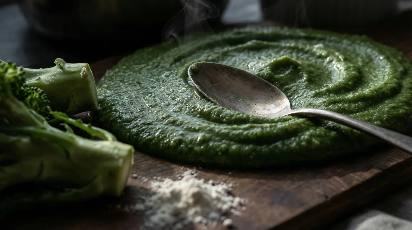 Esa dureza que tanto te frustraba se convierte repentinamente en la mayor de sus virtudes. Al no tener la textura porosa de las flores, el tallo derretido emulsiona sin retener tanta agua. Esto permite crear un puré denso y brillante que imita la textura y el peso de la mantequilla pomada.