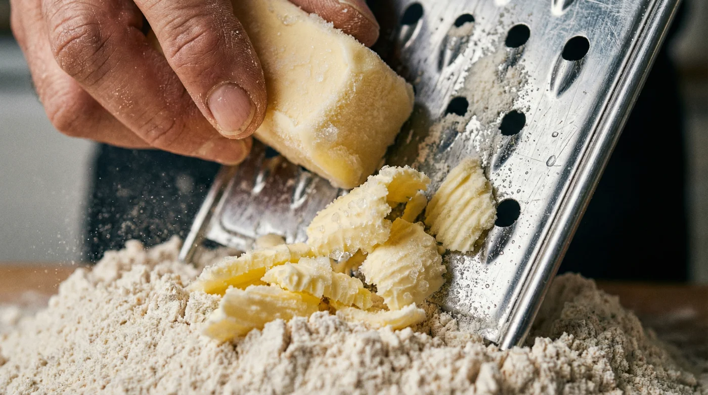 Al rallar mantequilla congelada, distribuyes cientos de pequeñas virutas uniformes directamente sobre la harina. Estas diminutas piezas heladas actúan como cápsulas de tiempo: se mantienen intactas durante el doblez y explotan en ráfagas exactas de vapor al tocar el calor a 200°C.