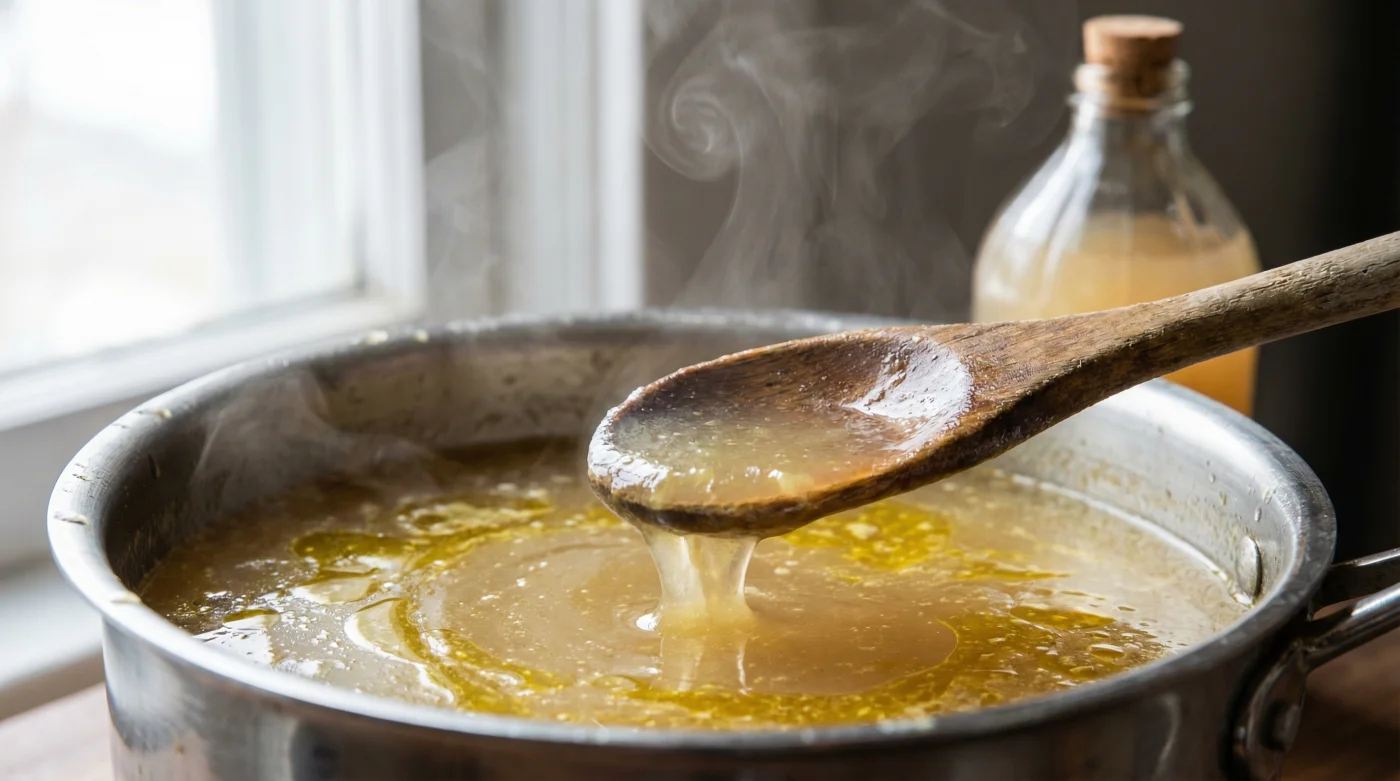 El ácido acético comienza a desarmar suavemente los enlaces de calcio en el hueso y a aflojar el tejido conectivo. Este proceso químico imperceptible facilita que la gelatina natural se rinda hacia el agua, logrando una concentración máxima que el calor por sí solo jamás alcanzaría. Lo que antes considerabas un error técnico, creyendo que simplemente te faltaba hervirlo más tiempo, se revela como tu ventaja definitiva frente a los fogones.