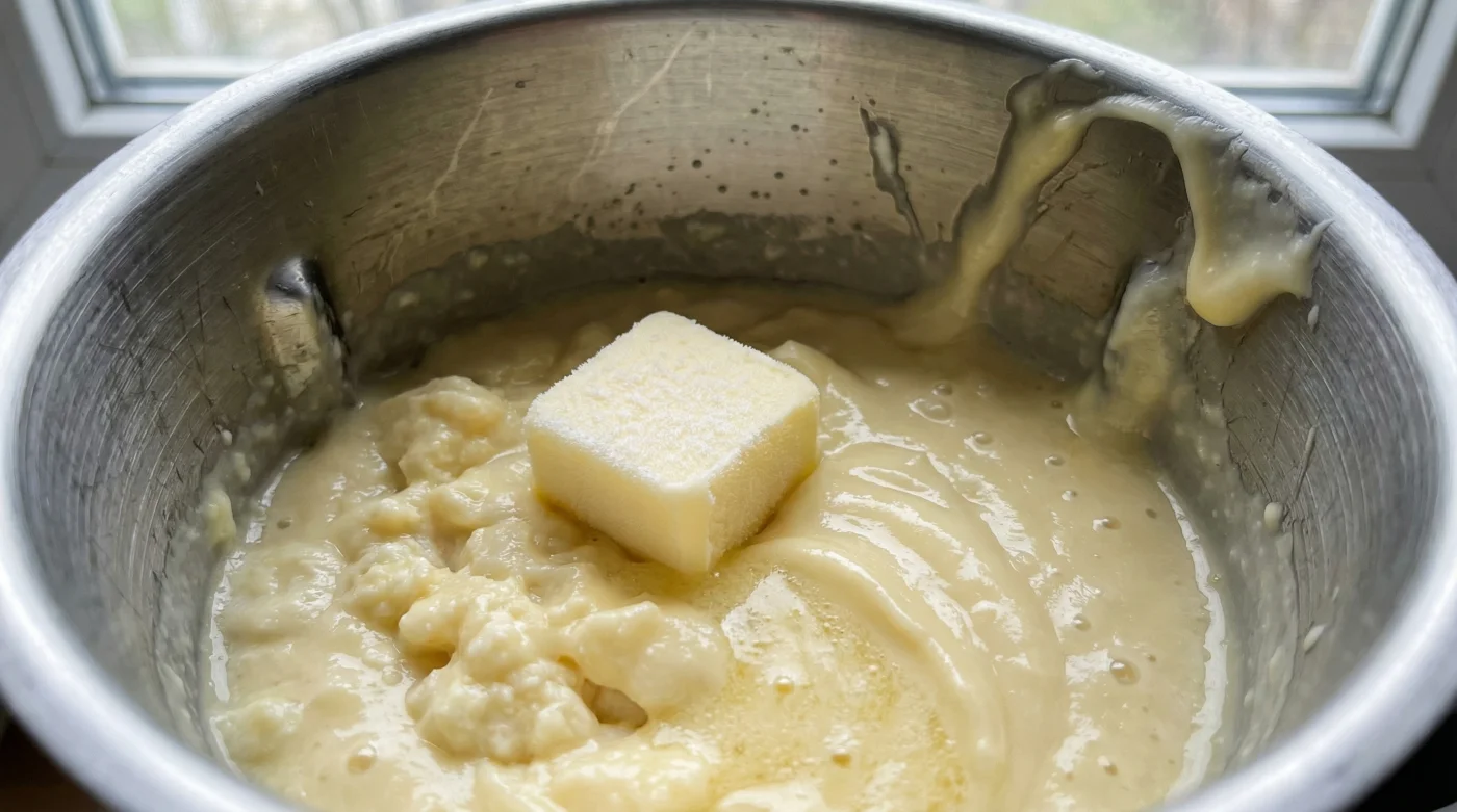 La mantequilla fría reemulsiona las grasas separadas por el exceso de calor. Actúa como un pegamento térmico, bajando la temperatura de la olla de un golpe repentino mientras aporta lípidos puros que engrasan y alisan la textura rebelde, devolviéndole su sedosidad original.