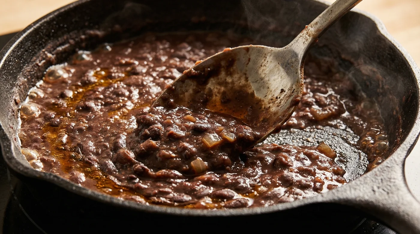 Entender el sistema significa reconocer que la cocina es un delicado juego de contrastes y afinidades. El café y el frijol comparten un perfil botánico de semillas tostadas. Al integrar una pequeña dosis de infusión oscura, actúas como un restaurador de arte que limpia el polvo de una pintura antigua para revelar su brillo original. La acidez sutil del café corta la grasa de la manteca o el aceite, mientras que su pigmento tiñe la mezcla hasta lograr ese tono de terciopelo oscuro que grita calidad de restaurante.