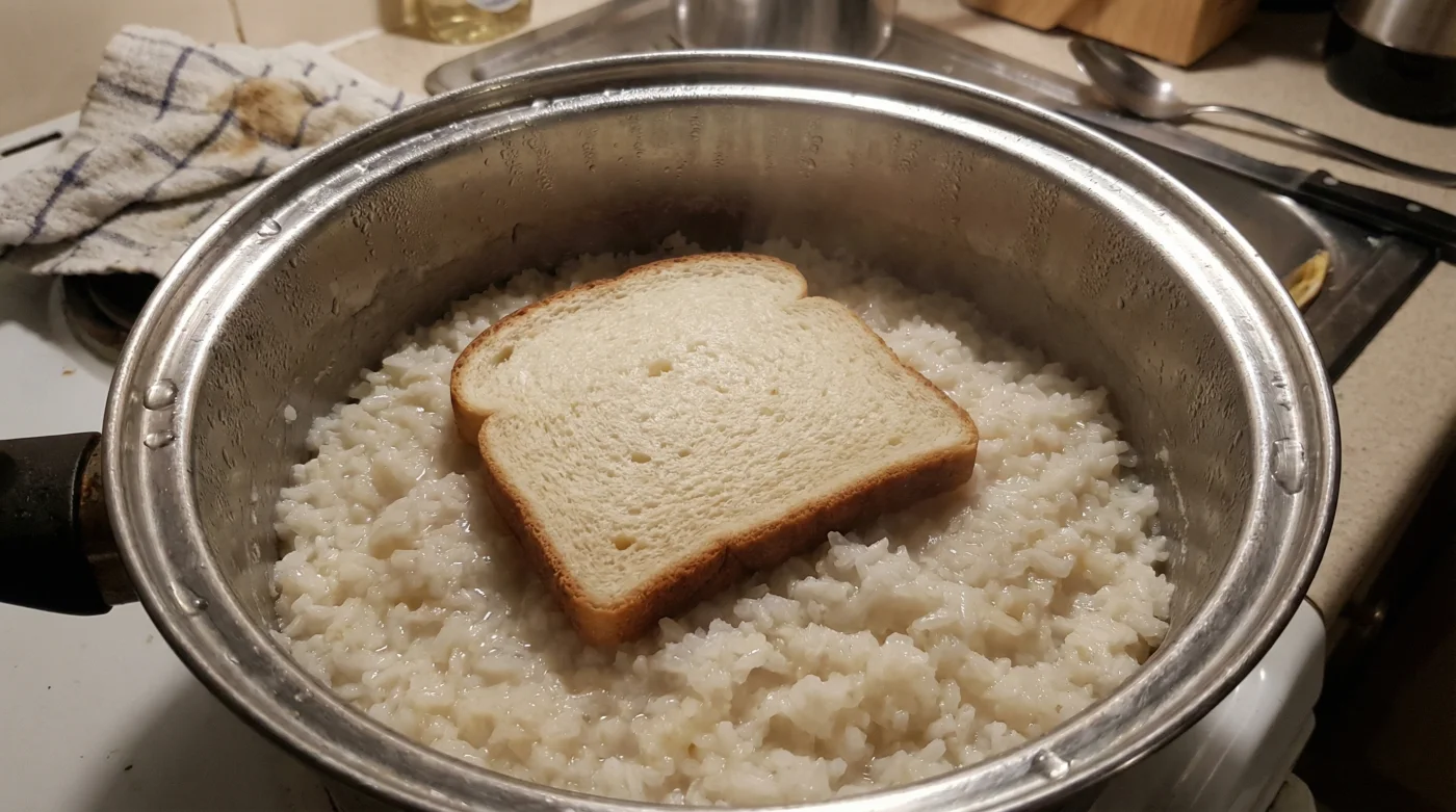 Aquí es donde entra tu salvavidas menos pensado: una simple rebanada de pan blanco de caja. En lugar de ver el arroz batido como un fracaso irreparable, considéralo un exceso de energía térmica y humedad que necesita ser redirigida urgentemente. El pan actúa como una esponja sedienta en medio de un cuarto inundado, absorbiendo rápidamente la humedad residual antes de que este vapor obligue al grano a desintegrarse por completo contra el fondo caliente.