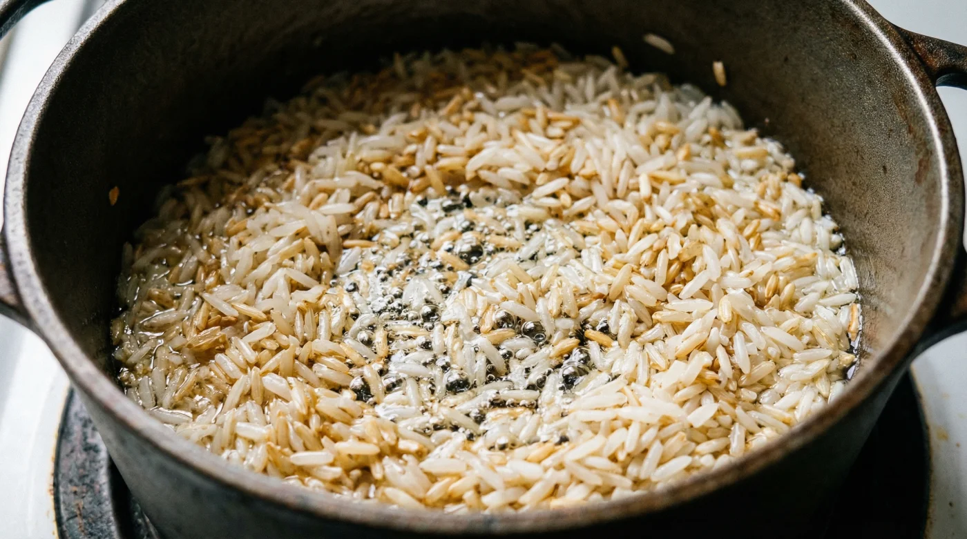 Imagina cada grano como una pequeña esponja frágil. Si la sumerges directamente en líquido hirviendo, su estructura colapsa, absorbiendo humedad sin control hasta reventar. Esa es la naturaleza del carbohidrato crudo al contacto repentino con el agua. La verdadera transformación ocurre cuando decides forjar una barrera térmica antes de que toque el caldo.