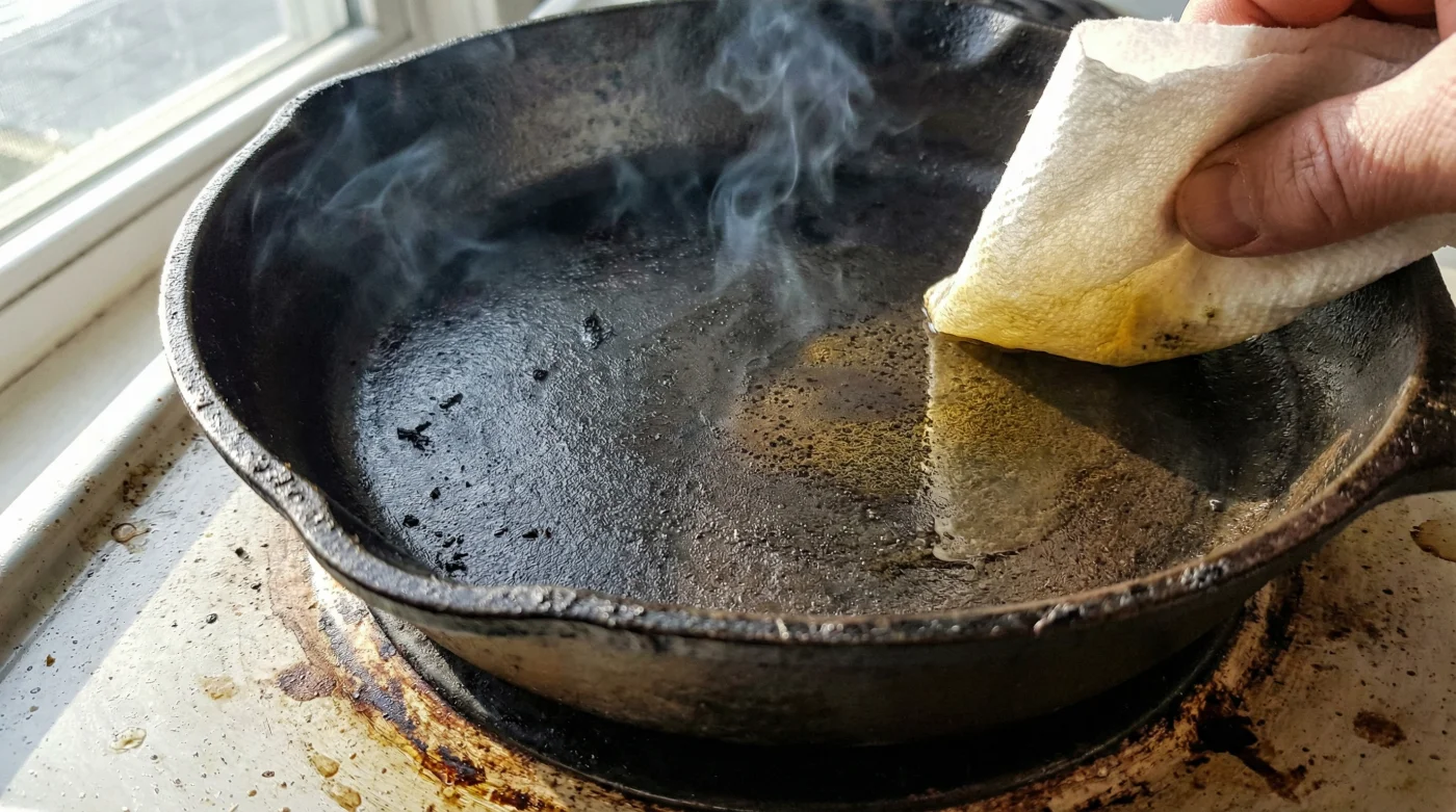 La verdadera magia detrás de este truco casero se llama polimerización. Cuando una grasa simple alcanza su punto de humo bajo un calor constante, sus moléculas internas se rompen por completo y se reorganizan. Forman una resistente capa plástica de origen natural que se fusiona microscópicamente con los diminutos poros del hierro, creando la mejor superficie antiadherente del mundo.