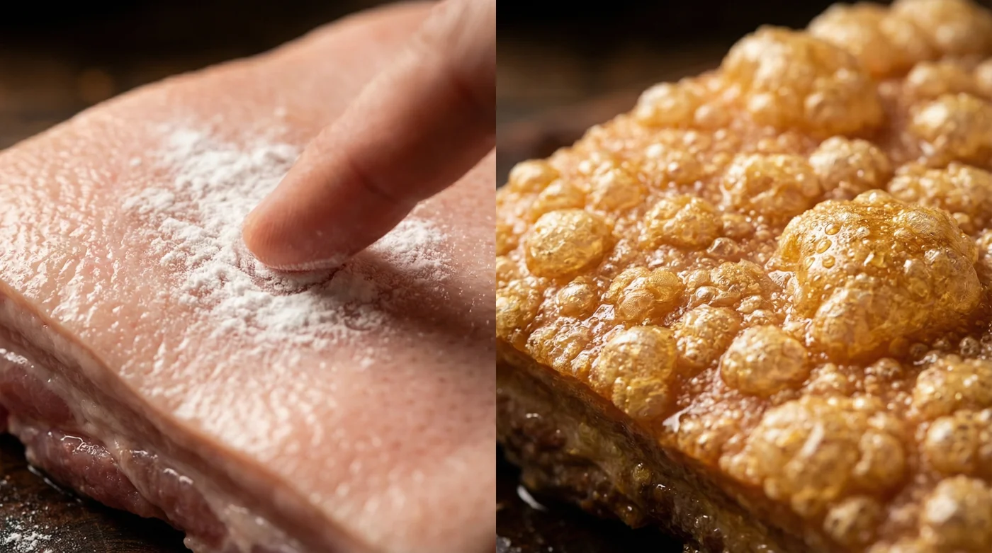 La capa externa de la panceta de cerdo es, en su estado más primitivo, una matriz celular extremadamente apretada de agua, colágeno y capas de grasa. Si le aplicas calor directo sin una preparación química previa, el agua atrapada en esta matriz hierve desde dentro. El vapor resultante ablanda el colágeno, cociéndolo como si fuera una sopa y creando esa textura plástica e inconfundible que arruina la comida. El mito gastronómico más extendido es creer que necesitas subir la temperatura del horno al máximo desde el minuto cero para lograr que se seque.