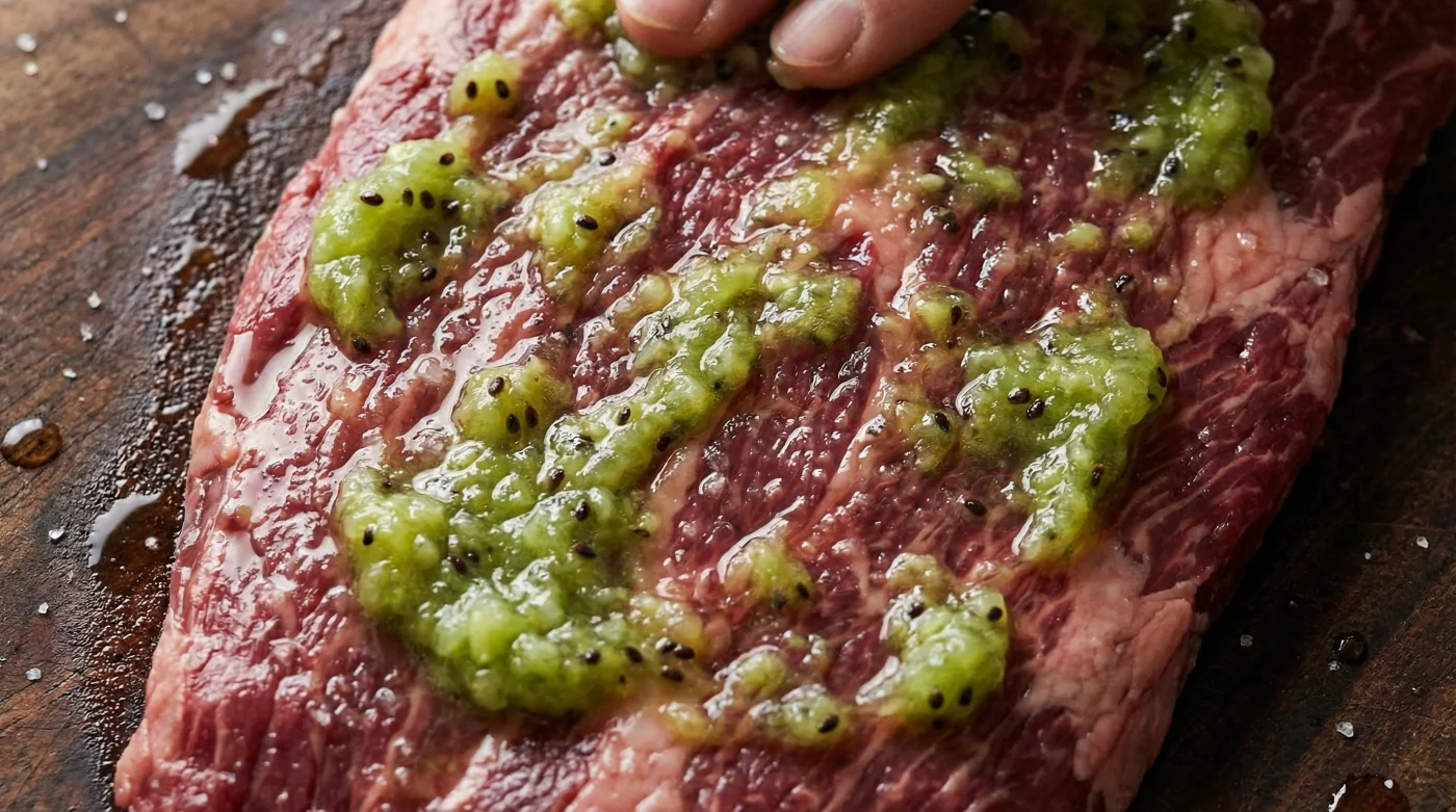 Es aquí entra la enzima actinidina, un componente natural exclusivo del kiwi verde que no quema, sino que corta con delicadeza. Funciona exactamente como millones de tijeras microscópicas que se deslizan entre los tejidos, rompiendo los enlaces tenaces de colágeno sin afectar la estructura central de la proteína animal.
