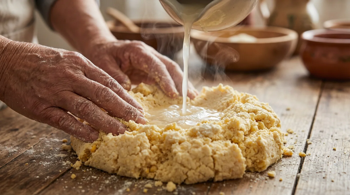 Para el cocinero apresurado de harina deshidratada: Si estás usando harina de maíz en paquete, el polvo procesado requiere un poco más de persuasión. En este caso, el agua tibia debe integrarse a cucharadas directas sobre la masa. El calor del líquido penetra rápidamente en las partículas secas, rompiendo la rigidez y formando una estructura compacta sin crear grumos en el fondo de tu tazón.