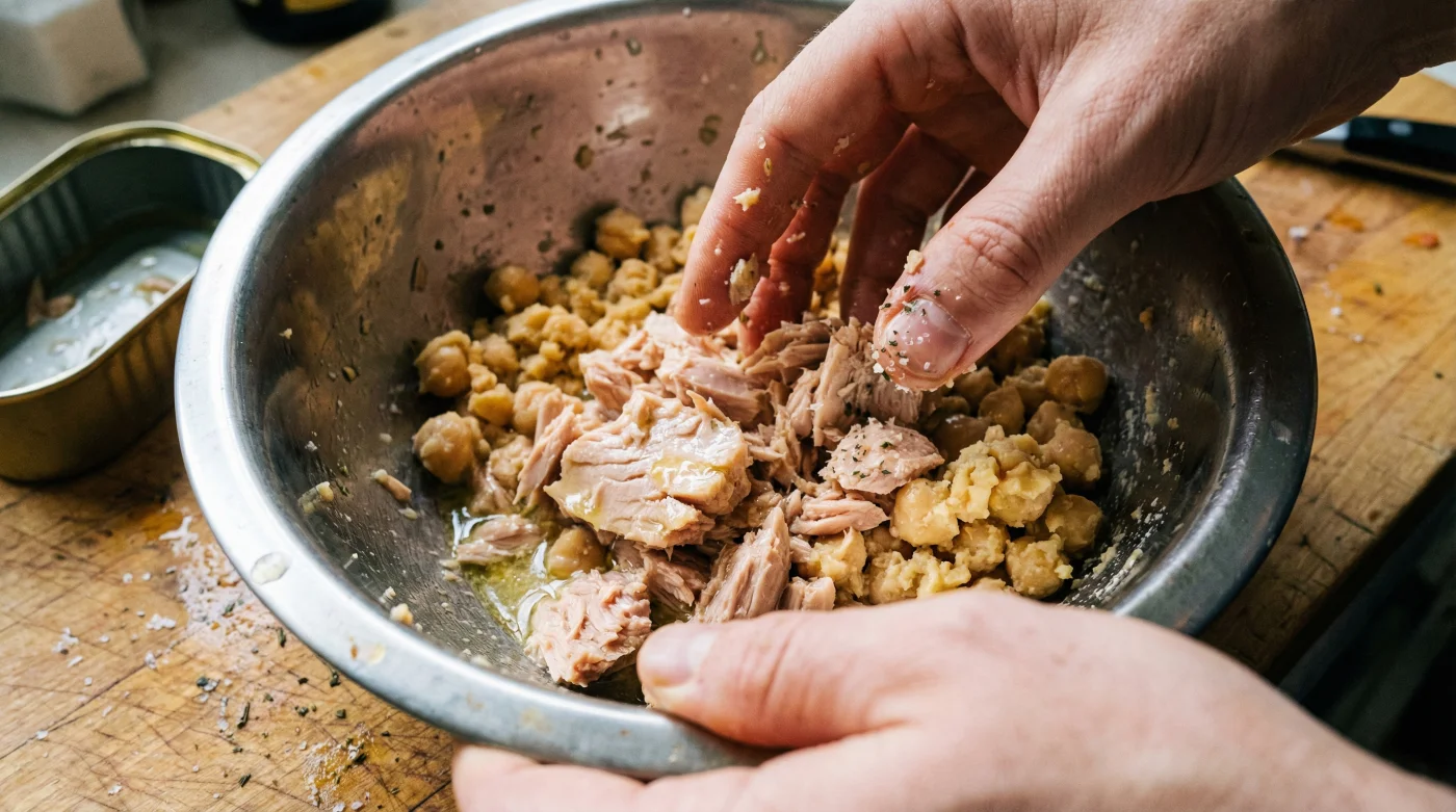 El proceso exige que uses tus manos y sientas los ingredientes. Comienza drenando el atún por completo. No lo presiones a medias; exprímelo hasta que quede como una esponja áspera. La humedad excesiva es el peor enemigo de la textura firme.